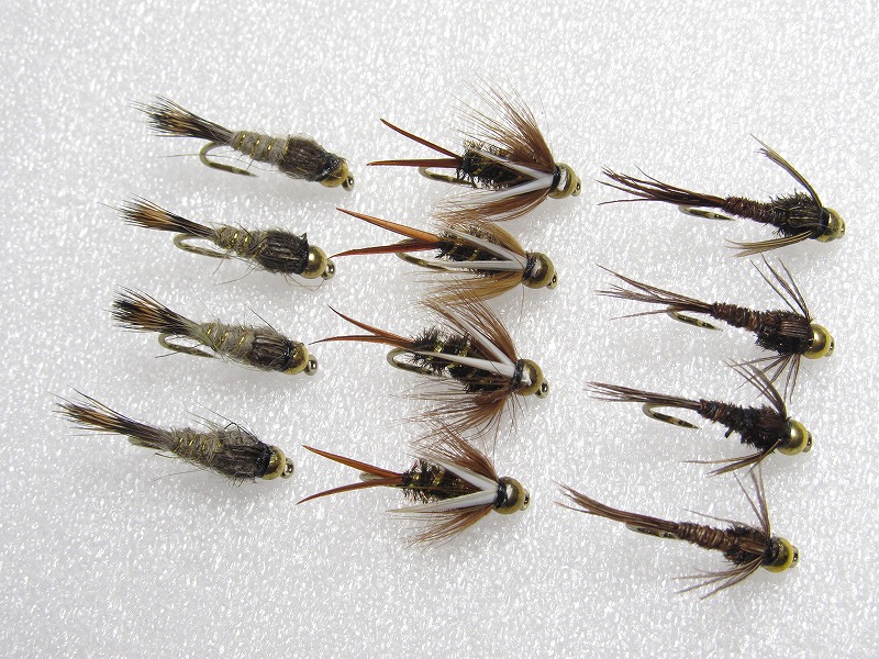 完成フライ、ビーズヘッドニンフの12本セットです。#10サイズが3パターン、各4本づつとなっております。