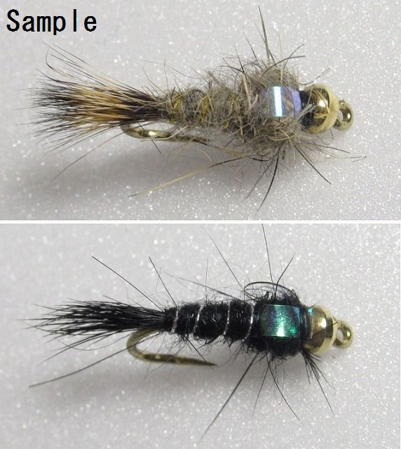 ビーズヘッド ニンフの完成フライ、ビーズヘッド GR ヘアーズイヤーブラック フラッシュバックの#10サイズです。
