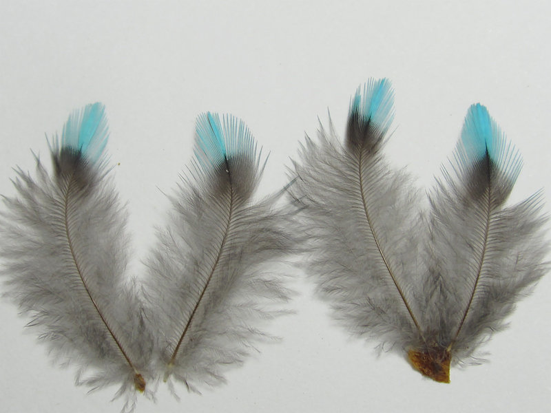 レアマテリアルのブルーチャテラー フェザーです。種類は、Cotinga cayana、ライトブルー チャテラーです。 サーモンフライのチークやサイドに多用されます。