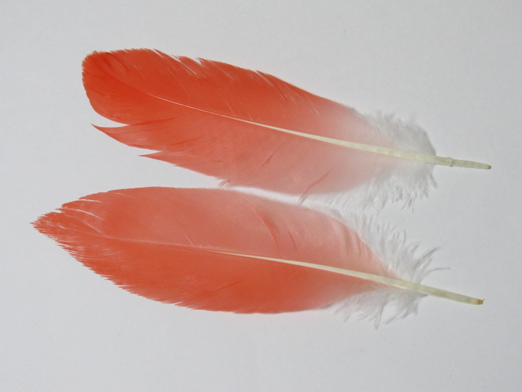 レアマテリアル、スカーレットアイビスのセカンダリーウイングフェザー1ペアです。 ショルダー側の長めファイバーのフェザーですが、スレや欠けがあります。
